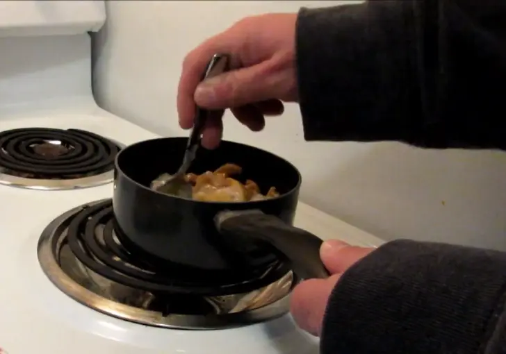 - Step 2: Combine Soup and Mushrooms – In a small saucepan over medium heat, add the cream of mushroom soup and drained mushrooms, stirring to mix evenly.