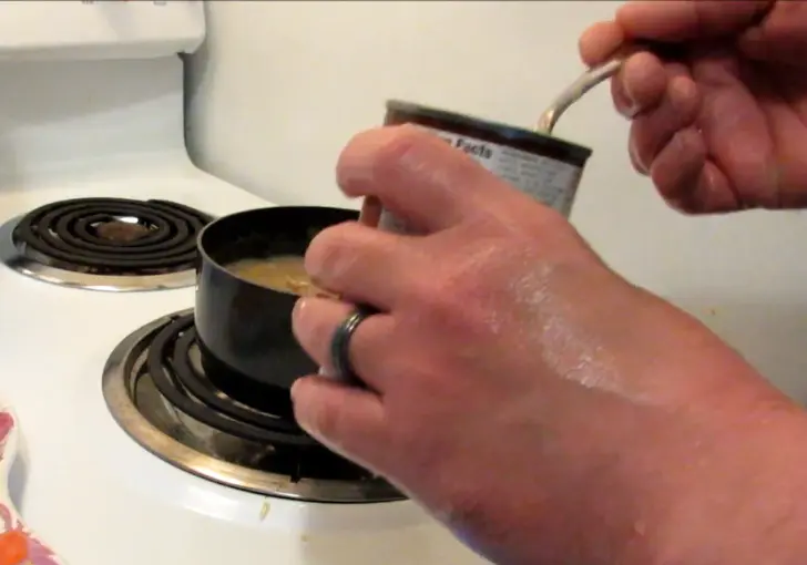 Open the beef gravy can and pour in about half of it (approximately ½ cup or 5 ounces). Stir the mixture until everything is well blended.