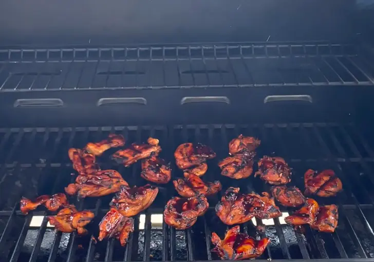 - Place the marinated chicken thighs on the grill, cover, and cook for 6–7 minutes on one side. Then flip each piece over and continue grilling for another 6–7 minutes on the other side.