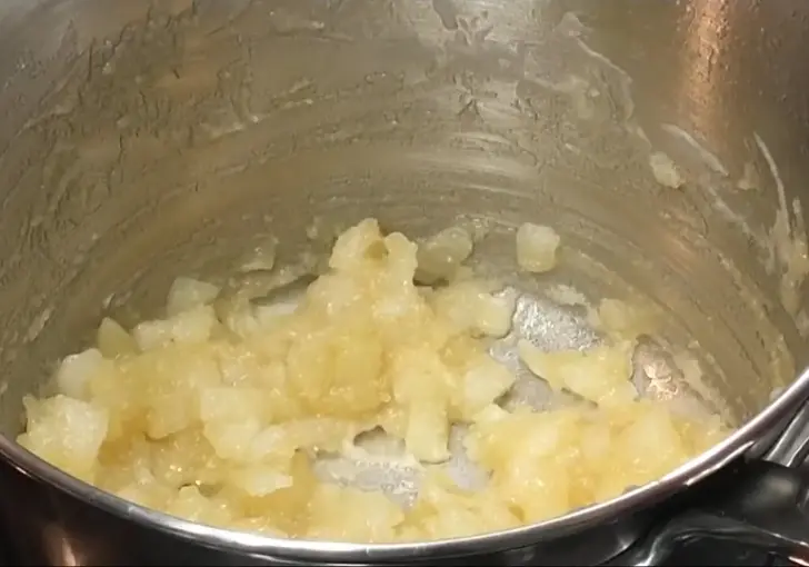 - In a medium saucepan over medium heat, melt the butter, then sprinkle in the flour. Stir continuously so the mixture cooks without burning. After about 1 minute, add the diced onion. Cook the butter-flour-onion mixture for 5 minutes, stirring often. The roux should bubble gently and smell slightly nutty.