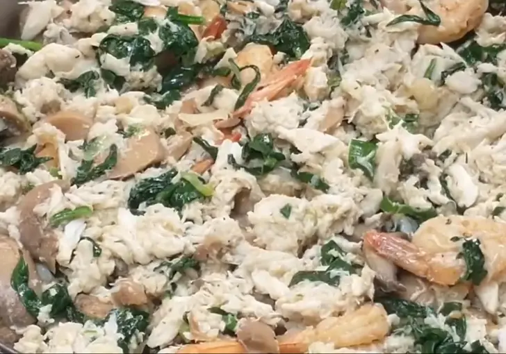 - Once the seafood begins to firm up, add the spinach and mushrooms. Sauté for 2 minutes, until the spinach wilts and the mushrooms soften. Sprinkle in the green onions and stir to combine.