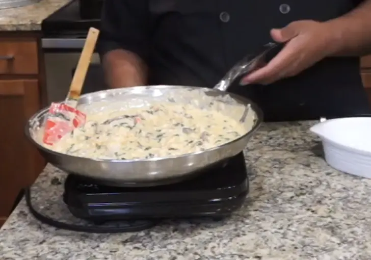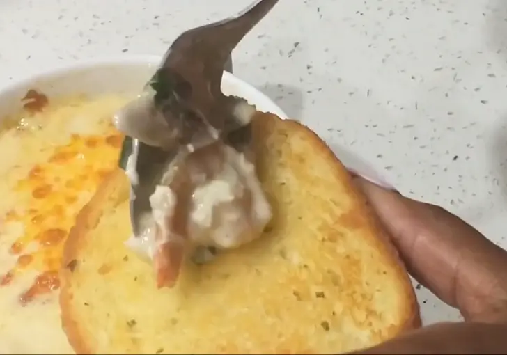 Once the top looks bubbly and perfect, take it out and serve hot. Grab your garlic bread and scoop a mix of shrimp, crab, crawfish, spinach, and mushrooms in every bite.
