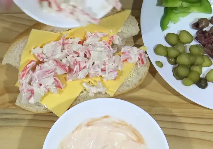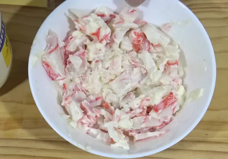 - Step 1: Prepare the Seafood Filling – Chop the seafood extender into small pieces, then mix with mayonnaise, lemon juice, salt, and a pinch of white pepper until creamy.