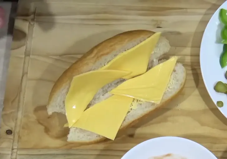 - Step 4: Add the Cheese Layer – Place the yellow cheese slices on the bottom half of the roll, adding extra if desired.