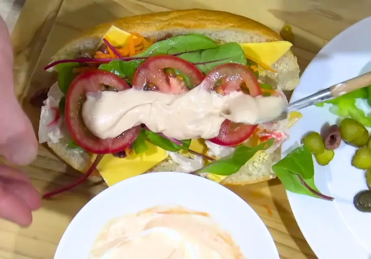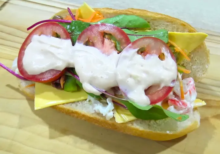 Drizzle your prepared seafood sauce generously over the top of the veggies and filling. The sauce adds tang, creaminess, and that finishing touch that ties the sandwich together.
